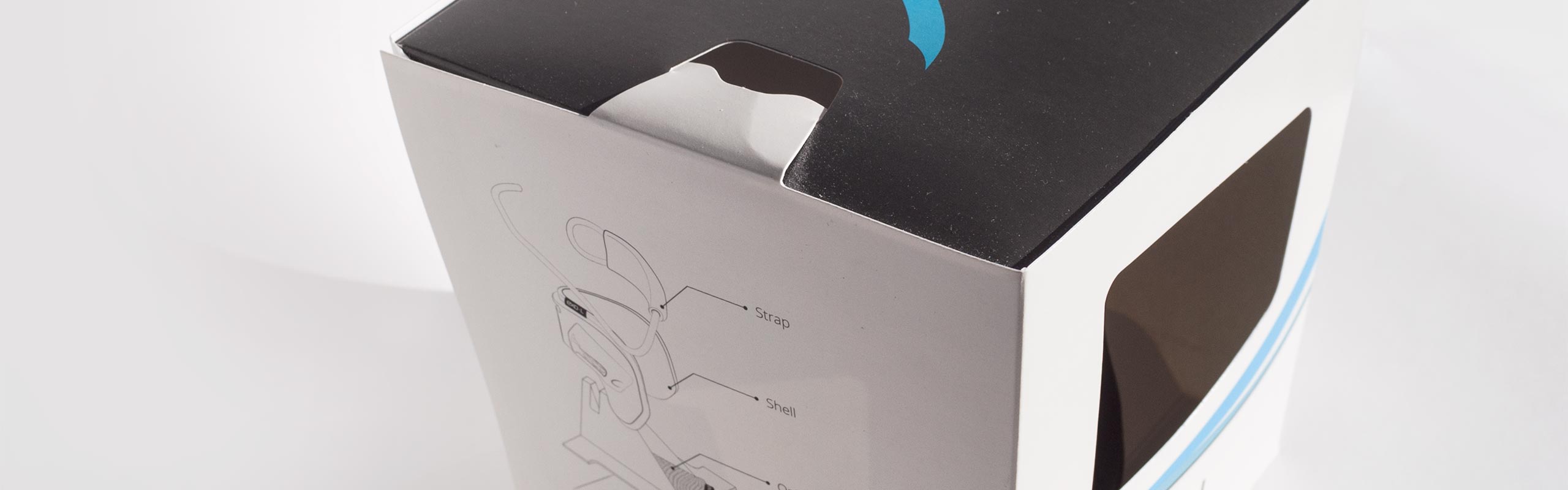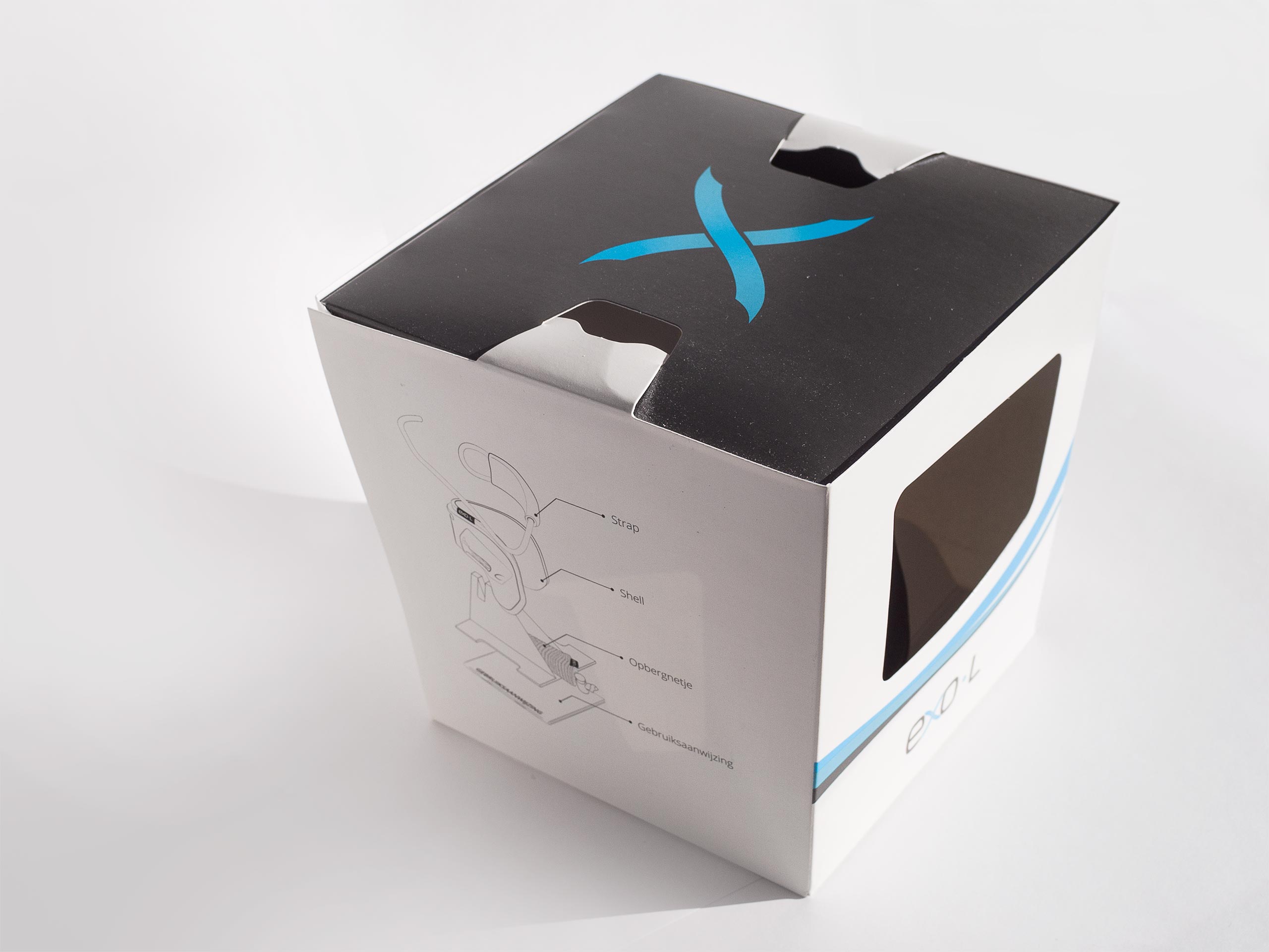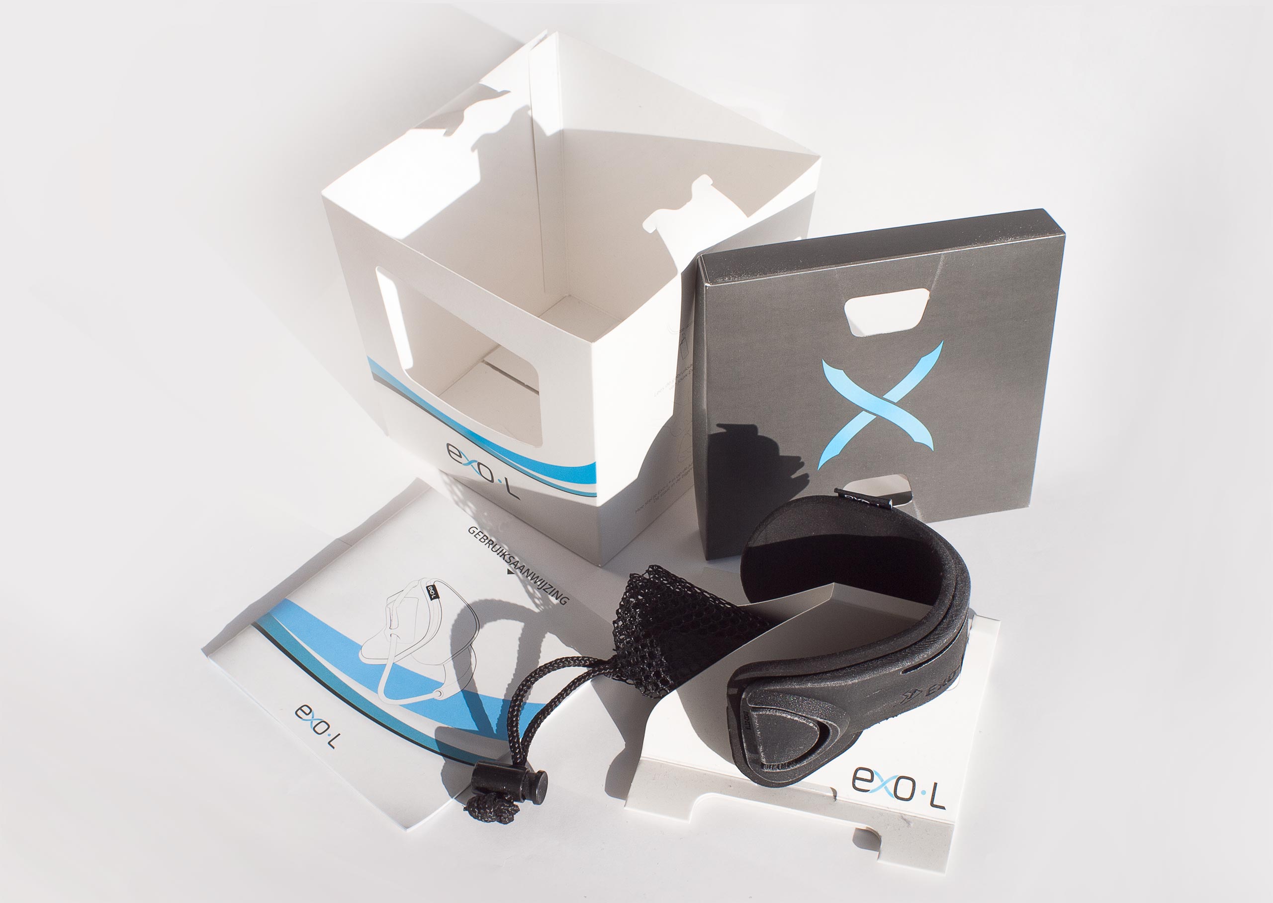 The box contains a folded structure in both the lid and a separate stand which keep the Exo-L positioned. The manual lies on the bottom of the box and the travel pouch is folded up and tucked away into the stand.