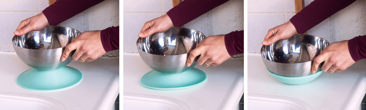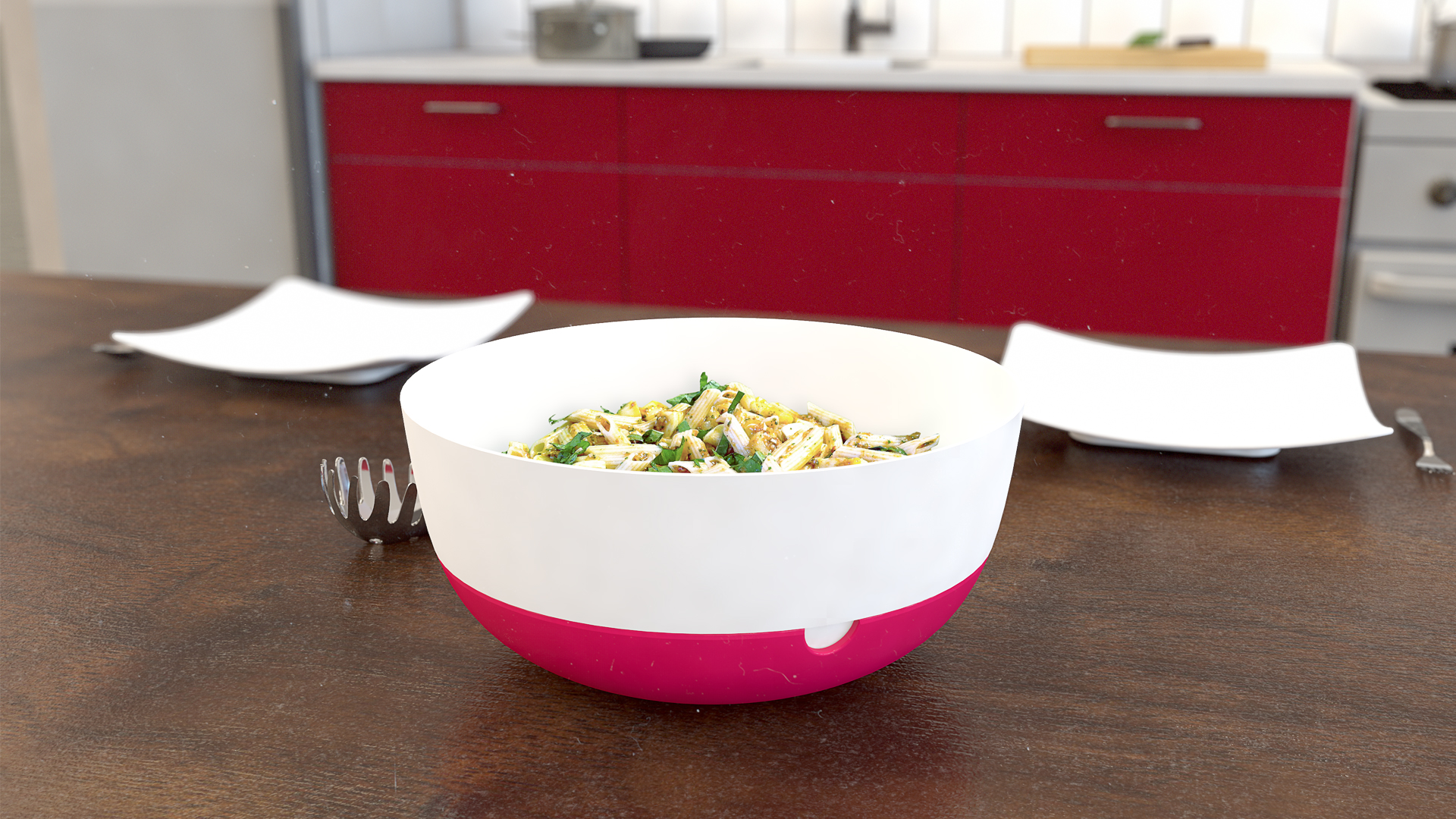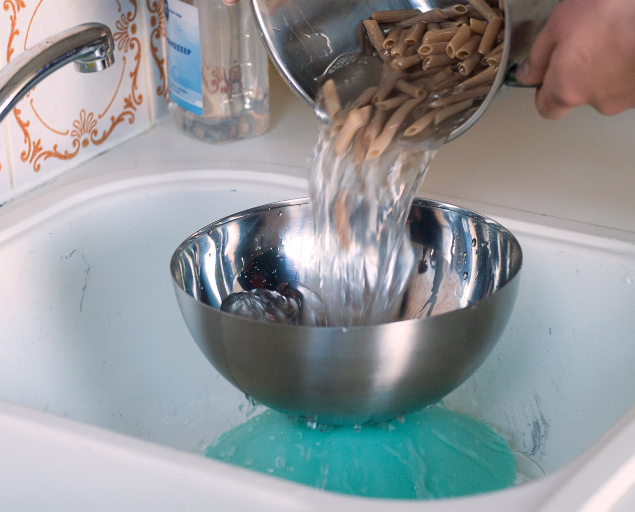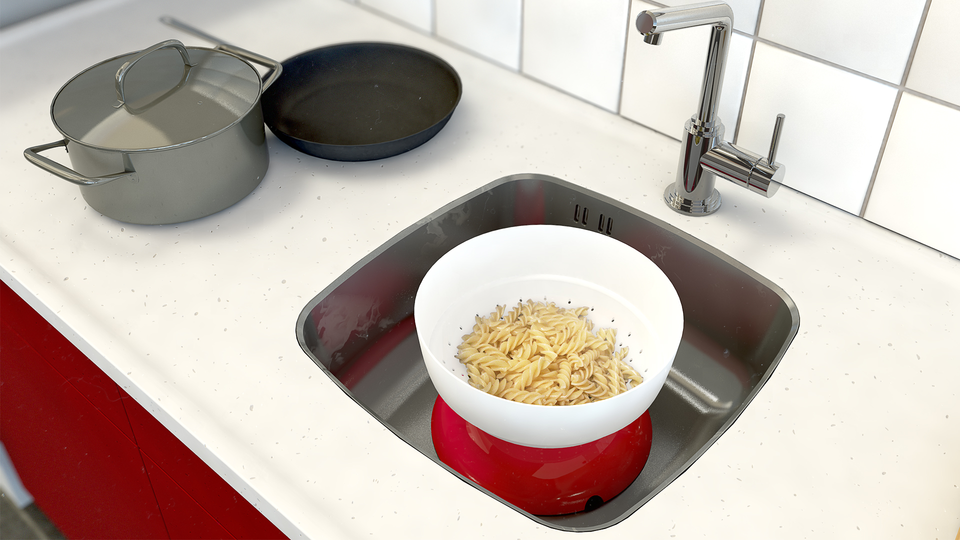 Simple kitchenware to combine two commonly used functions. Let the water run out of the colander, push it down and the silicone rubber flips up to seal the holes and turns it into a bowl ready to receive sauce and served on the table.