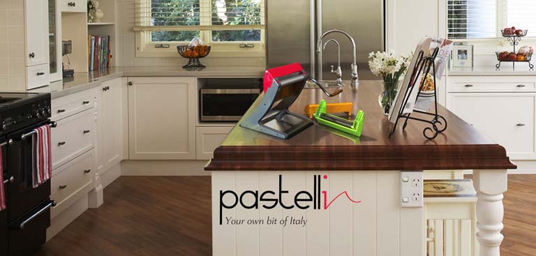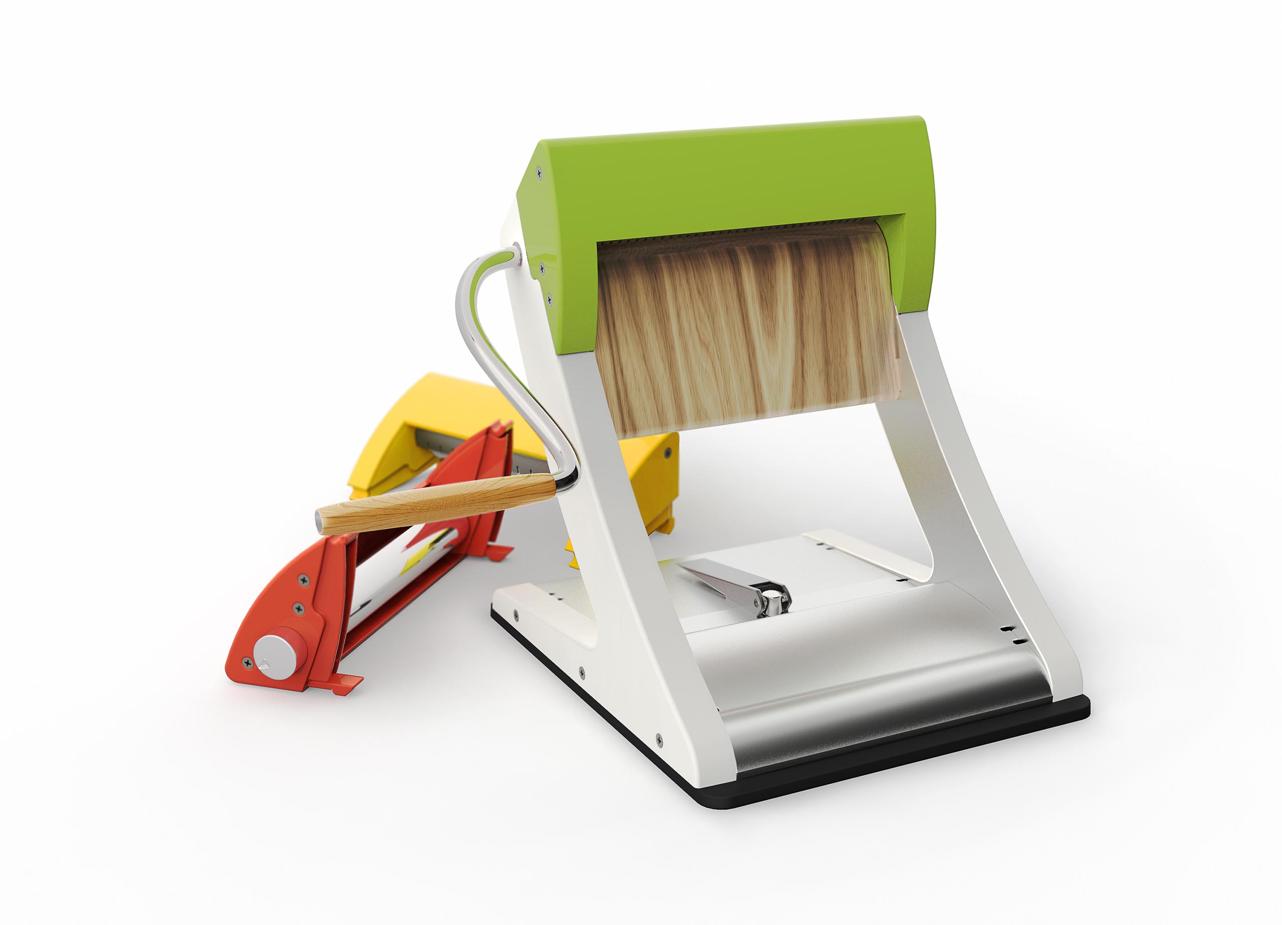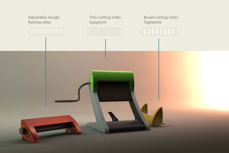 The pastelli is a hand powered pasta machine that has three exchangeable modules for different tasks. The goal of the project was to create a modern pasta machine based on the technical principle of an old patent which describes the use of an adjustable roller system with an edge to scrape the dough from the roller to prevent sticking.