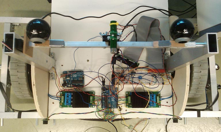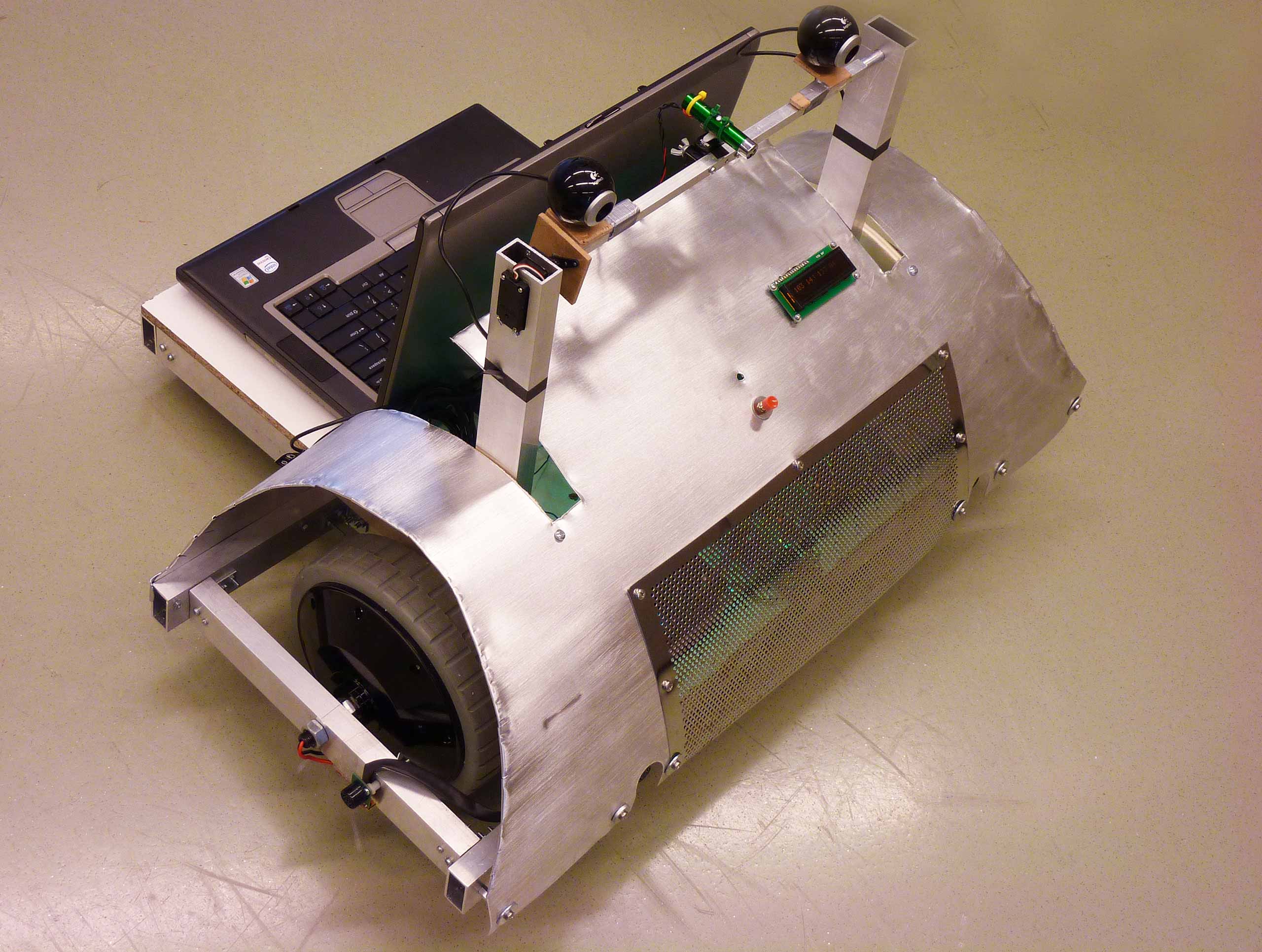 At the final stage the robot was required to complete a test track. The laptop on the robot was running software that calculated the distance to an object using a video feed from two web cams, in the same way that humans perceive distance.