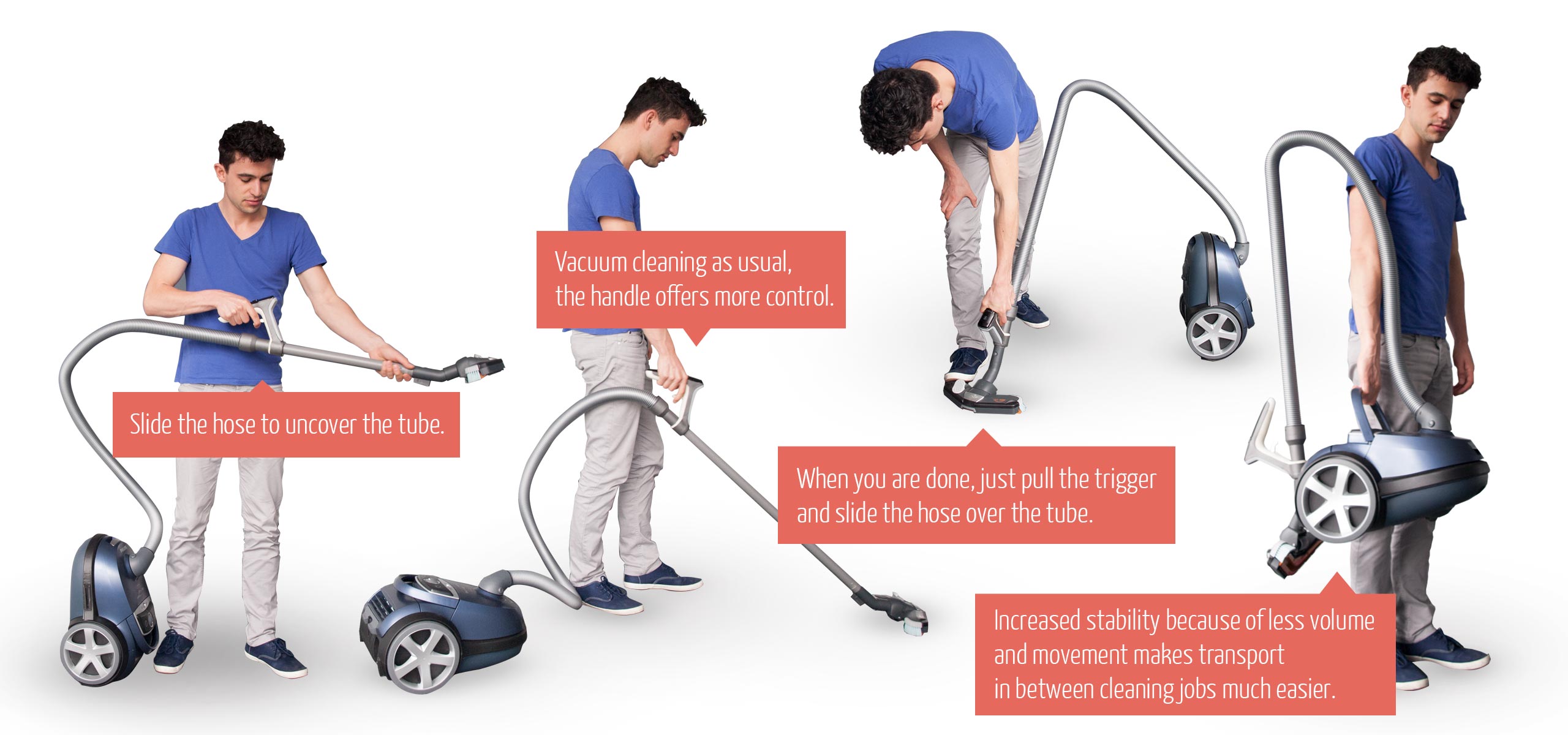 Our solution is to introduce a system where the hose can be easily moved to cover the tube, which decreases the volume footprint and increases overall rigidity of the vacuum cleaner during transport. Within this project we have gone from idea to materialisation, including a fully functional prototype.
